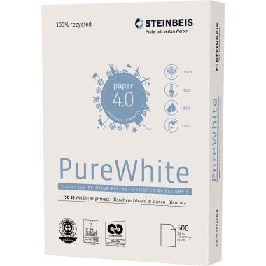 Steinbeis Kopierpapier Pure White DIN A3 80g/m² weiß 500 Bl./Pack. · Anzahl der Blätter je Packung: 500 Bl./Pack. · Weißgrad (ISO): 90 · Nordischer Schwan: Nein · Weißgrad (CIE): 110 CIE · Verwendung für Druck- oder Schreibgerät: Laserdrucker, Inkjetdrucker, Kopierer, Faxgeräte · PEFC: Nein · Papierformat: DIN A3 · Opazität: 95% · Zertifikat/Zulassung: Blauer Engel, EU Ecolabel · Ausführung des Papiertyps: 100 % Altpapier · Grammatur: 80 g/m² · Forest Stewardship Council (FSC): Nein · Farbe: weiß · EU Ecolabel: Ja · Blauer Engel: Ja · beidseitig bedruckbar: Ja · Laufrichtung: Breitbahn