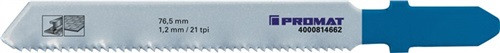 aus legiertem Werkzeugstahl · passend für Stichsägen der Fabrikate AEG, Bosch, DeWalt, Mafell, HOLZ-HER, Makita, Metabo, Milwaukee, u.v.m. · Weitere technische Eigenschaften Zahnteilung: 1,2mm • St. je Karte: 5 • entspricht Nr.: Bosch T 118 A • Gesamtlänge: 76,5mm