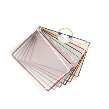 Mit farbigem, kunststoffummanteltem Stahldraht gerahmt. Leichtes Einsetzen und gutes Handling durch stabile Metall-Drehzapfen. Reflexfrei. 5 Aufsteckreiter 50mm (Kartoneinlagen neutral/farbig).