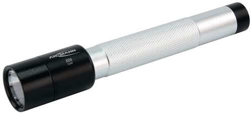 mit LED Technik · spritzwassergeschützt · handliche Metalltaschenlampe mit hochleistungs-LED · silberfarben mit schwarzen Applikationen · Lieferumfang inkl. Batterien (2 x Typ AA) und robuster Handschlaufe