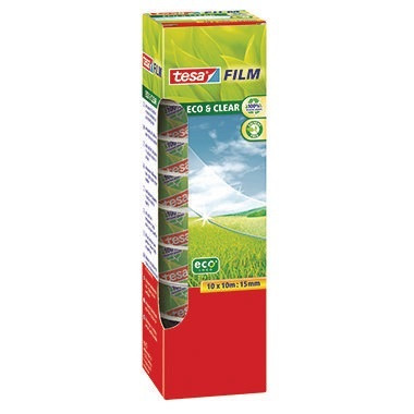 Umweltfreundlicher tesafilm®. Nahezu unsichtbar auf fast allen Untergründen. Starke Klebkraft. Gleichmäßiges und geräuschloses Abrollen. Für alle tesafilm® Abroller geeignet. Verpackung aus 80 % recyceltem Karton. · unsichtbar: Nein · Werkstoff: Polypropylen · schattenfrei kopierbar: Nein · säurefrei: Nein · reißfest: Ja · ohne Lösungsmittel: Ja · Maße: 15 mm x 10 m (B x L) · alterungsbeständig: Ja · hitzebeständig: Nein · freier Inhalt: 10 Rl./Pack. · Farbe: unsichtbar · Breite: 15 mm · beschriftbar: Nein · beidseitig klebend: Nein · lichtpausfähig: Nein · wieder ablösbar: Nein