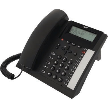 Analoges Telefon mit Headset-Anschluss. Betrieb an Telefonanlagen oder Amt. Alphanumerisches Display mit guten Kontrasteigenschaften. Rufnummernanzeige. Namensanzeige. Anrufliste der letzten 50 übertragenen Rufnummern mit Datum und Uhrzeit. Wahlwiederholungsliste der letzten 50 Rufnummern mit Datum und Uhrzeit. Lautsprecher- und Tonruflautstärke einstellbar. Mikrofonstummschaltung, Anzeige durch integrierte LED. Wahlvorbereitung. 16 verschiedene Anrufsignale einstellbar. Moderne menügeführte Bedienoberfläche. Multilingual (12 Displaysprachen). 12 beleuchtete Zielwahltasten mit Anruferidentifizierung (LED leuchtet bei eingehendem Anruf des hinterlegten Teilnehmers). Gut sichtbare Leuchtdiode zur Message-Waiting-Indication (MWI). Headset-Anschluss. Nebenstellenfähig. Hörgerätekompatibel (integrierter Magnetfelderzeuger). Veränderbare Gerätestandstütze erlaubt drei Neigungswinkel. Standfuß als Wandhalterung einsetzbar. · Fernabfragefunktion: Nein · max. Anzahl der Telefonnummern: 99 Telefonnummern · Maße: 21 x 13 x 18 cm (B x H x T) · integrierter Anrufbeantworter vorhanden: Nein · Freisprechen vorhanden: Ja · Farbe: schwarz · Datumsanzeige vorhanden: Ja · Art des Displays: LC-Display · Anzahl der Zielwahltasten: 12 Zielwahltasten · Anzahl der Display-Zeilen: 3 Display-Zeilen · Uhrzeitanzeige vorhanden: Ja · Gewicht des Basisgerätes: 610 g