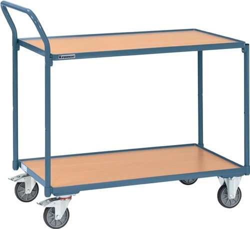 Stahlrohr und Profilstahl geschweißt · pulverbeschichtet taubenblau, RAL 5014 · schlag- und kratzfest · Ladeflächen aus Holzwerkstoffplatten, Oberfläche Buchedekor, im Winkelstahlrahmen liegend, Rand 12 mm hoch · 2 Lenkrollen mit Feststeller und 2 Bockrollen · TPE-Bereifung, Naben mit Rillenkugellager · Tragfähigkeit obere Ladefläche 80 kg · Zerlegte Anlieferung · Weitere technische Eigenschaften Oberfläche: pulverbeschichtet • Etagenhöhe: 200/820mm • Tragfähigkeit obere Ladefläche: 80kg • Gewicht: 37kg • Rad-Ø: 125mm • Gestell: Stahlrohr • Bereifung: TPE • Gesamthöhe: 1040mm • Gesamtbreite: 600mm • Bremssystem: mit Radfeststeller • Gesamtlänge: 1135mm