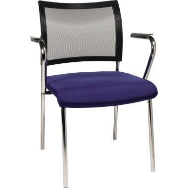 Rückenlehne mit Netzbespannung. · Werkstoff der Sitzfläche: Polypropylen · max. Gewicht des Nutzers: 110 kg · max. Sitzhöhe: 43 cm · min. Sitzhöhe: 43 cm · Sitzform: Muldensitz · Sitzpolsterung vorhanden: Ja · Stapelkapazität: 2 Stühle · Werkstoff des Gestells: Stahl · Werkstoff der Rückenlehne: Netzstoff · Höhe der Rückenlehne: 32 cm · Höhe der Rückenlehne ab Sitz: 39 cm · Tiefe der Sitzfläche: 45 cm · Farbe der Sitzfläche: blau · Ausführung der Lieferzusammenstellung: inkl. 2 Armlehnen · Masse (Gewicht): 7,6 kg · Breite des Sitzes: 48 cm · Farbe der Rückenlehne: schwarz · Bauform der Armlehne: Ringarmlehne · Form des Gestells: 4-Fuß · Garantie gewährt: Ja · Garantiedauer: 3 Jahre · Gleiter vorhanden: Ja · Griffloch vorhanden: Nein · Farbe der Armlehne: chrom