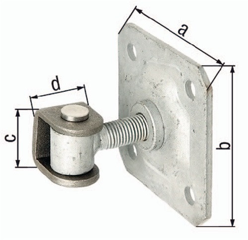 Ausführung: verstellbar um 20 mm · U-Bügel Material: Stahl roh · Verbindungsbolzen und Sicherungsring Material: Edelstahl · Augenschraube Oberfläche: feuerverzinkt zum Anschweißen · Weitere technische Eigenschaften Maß c: 44mm • Maß d: 35mm • Maß a: 100mm • Maß b: 100mm