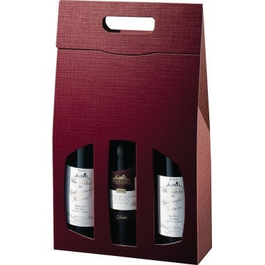 Geschenktragetasche mit strukturierter Oberfläche für Wein- und Sektflaschen mit extra langem Sichtfenster und perfektem Tragegriff. Lieferung ohne Inhalt. · Verwendung für Produkt: 3 Flaschen · Werkstoff: Karton · Oberflächenstruktur: geprägt · Maße: 27 x 36,5 x 9 cm (B x H x T) · Griff vorhanden: Ja · Farbe: bordeaux · Boden vorhanden: Ja