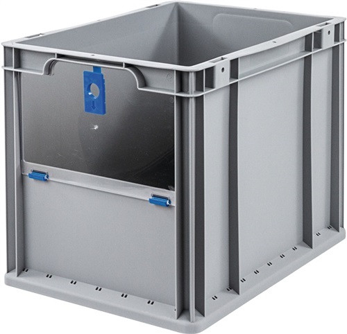 grau · formstabiles Polypropylen · rippenverstärkte Wände · abgestimmt auf Europaletten-Maße · selbstzentrierender, umlaufender Stapelrand · optimale Reinigung durch glatte Innenwände · widerstandsfähig gegen die meisten Säuren und Öle · Temperaturbeständig von -10 °C bis +60 °C · geschlossene Wände · frontseitige Entnahmeöffnung · Klappscheibe · Schiebeverschluss · Weitere technische Eigenschaften Seitenwände: geschlossen • Innenhöhe: 315mm • Innenlänge: 365mm • Innenbreite: 265mm