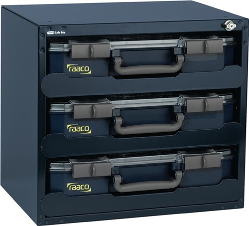 stabiles Stahlblechgehäuse · die einzelnen Tableaus "laufen" auf wartungsfreien Teleskopschienen, die sich nach dem Einschieben automatisch verriegeln und zusätzlich abschließbar sind · bestückt mit Sortimentskästen aus schlagfestem Polypropylen (Boxen) · die aus unzerbrechlichem Polycarbonat gefertigten Deckel haben ein Raster auf der Innenseite, welches das Verrutschen kleinster Teile verhindert · die Sortimentskästen sind mit einem ergonomischen Tragegriff ausgestattet · sehr gut geeignet für die Einrichtung von Werkstätten und Servicefahrzeugen Bestückung: 3 Sortimentskästen mit 15 herausnehmbaren Facheinsätzen - Gesamtgröße B 415 x T 330 x H 80 mm