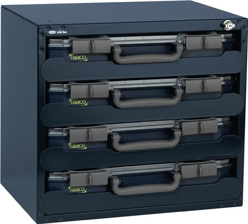 stabiles Stahlblechgehäuse · die einzelnen Tableaus "laufen" auf wartungsfreien Teleskopschienen, die sich nach dem Einschieben automatisch verriegeln und zusätzlich abschließbar sind · bestückt mit Sortimentskästen aus schlagfestem Polypropylen · die aus unzerbrechlichem Polycarbonat gefertigten Deckel haben ein Raster auf der Innenseite, welches das Verrutschen kleinster Teile verhindert · die Sortimentskästen sind mit einem ergonomischen Tragegriff ausgestattet · sehr gut geeignet für die Einrichtung von Werkstätten und Servicefahrzeugen Bestückung: 2 Sortimentskästen mit 25 herausnehmbaren Facheinsätzen in einer Größe - Gesamtgröße B 415 x T 330 x H 57 mm 2 Sortimentskästen mit 25 herausnehmbaren Facheinsätzen in 3 unterschiedlichen Größen - Gesamtgröße B 415 x T 330 x H 57 mm