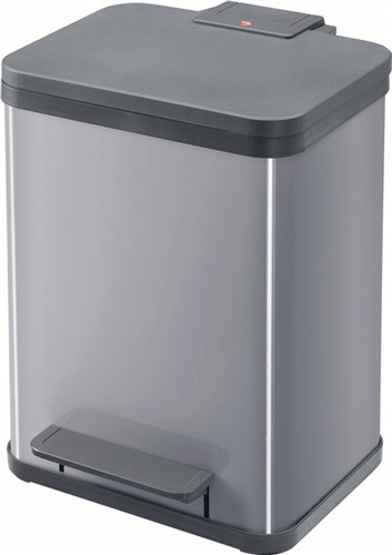 Gehäuse aus pulverbeschichtetem Stahlblech, silber · Deckel Kunststoff, schiefergrau · mit schiefergrauem Kunststoff-Inneneimer · breites Fußpedal aus schiefergrauem Kunststoff, innenliegende Tretmechanik · inkl. Farbsticker für Müllsorten-Kennzeichnung · Weitere technische Eigenschaften Deckelausführung: Kunststoff