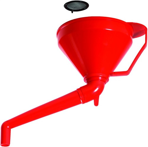 HD-PE · orange · mit Handgriff · mit abschraubbarem, starren Winkelrohr · lebensmittelecht (LFGB konform) · herausnehmbares Feinsieb aus Metall · hoher Rand für großes Fassungsvermögen und Spritzschutz · mit Entlüftungsstegen für schnellen Durchlauf · bruchfeste, stabile Ausführung · kraftstoff-, öl- und säurebeständig · speziell für unzugängliche Stellen · Weitere technische Eigenschaften Farbe: orange