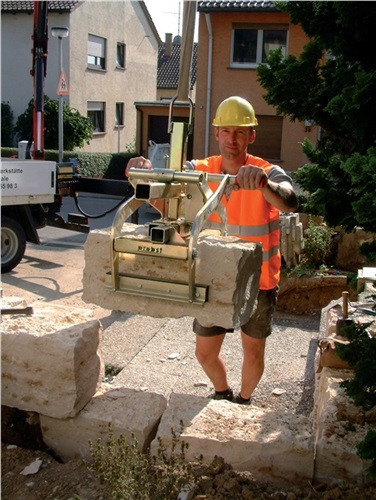 geeignet zum Greifen und Versetzen von Trittstufen, Bordsteinen, Randwinkeln, L-Steinen usw. · mit einem Hebezeug · einfache Öffnungsweitenverstellung mittels Federriegel · konisch zulaufende Bordsteine werden sicher gegriffen · mit Einhängeöse für Kranhaken · Wechselautomatik zur vollautomatischen Umschaltung von voll auf leer · austauschbare Gummimetallschienen · galvanisch verzinkt · Gewicht 29 kg · Weitere technische Eigenschaften Oberfläche: galvanisch verzinkt • Gewicht: 29kg