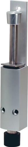 Gehäuse aus Aluminium · sämtliche weiteren Metallteile aus Stahl, verzinkt · Stopfen aus Gummi, schwarz · die Tür kann in jedem Öffnungswinkel festgestellt werden · die serienmäßig montierte Konterfeder erhöht den Anpressdruck auf dem Boden. · Montagehinweis: Der Türfeststeller wird bei größtmöglichem Abstand zum Türband an die Tür geschraubt. Der Abstand von Unterkante Tür bis Stopfen soll 5-10 mm betragen. Anschraubanleitung, Bohrschablone sowie Befstigungsmaterial inkl. Max. Türgewicht 40 kg · Weitere technische Eigenschaften Breite: 35mm • Tiefe: 35mm • Höhe: 225mm