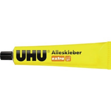 Der UHU® Alleskleber extra ist der einzigartige, gelartige Kunstharzklebstoff für schnelle und glasklare Klebungen. Die gelartige Konsistenz des Klebstoffes ermöglicht tropffreies und sauberes Kleben, der Klebstoff fließt nicht weg. Ideal für senkrechte Flächen. Keine Papierwellung. · nachfüllbar: Nein · auswaschbar: Nein · Typbezeichnung des Spezialverschlusses: Drehverschluss · Produktverwendung: universell · Ausführung des Behälters: Tube · Gefahrengutkennzeichnung (UN-Nr.): UN1133 · Masse (Gewicht): 31 g · Kategorie der Anfangshaftung: hoch