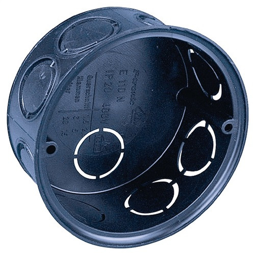 ausbrechbare Öffnungen für Leitungen und Rohre bis Nenngröße 16 und IEC-Rohr-Ø 20 mm · mit Verstärkungsrand · mit 2 Schraublöchern · für Feder- oder Schraubdeckel · Abstand Deckelschrauben 67 mm · Schutzart IP20 · Polysterol · flammwidrig 650 °C · halogen- und silikonfrei · ohne Geräteschrauben