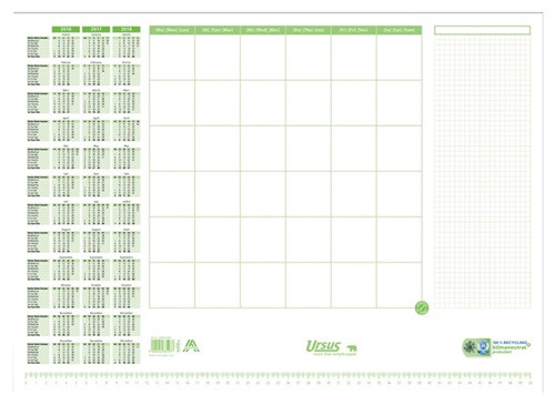 Ursus® Green - Produkte für Umweltschützer! Klimaneutrale Produktion: Einsatz von umweltschonenden Rohstoffen und CO² neutralem Papier. Gegenüber herkömmlichen Produkten fallen bei der Fertigung um durchschnittlich 92,1 % weniger CO2-Emissionen an. Produktdesign im Eco-Umwelt-Look. · Kalender vorhanden: Ja · Verwendung für Kalenderjahr: 2016-2018 · Werkstoff: Recyclingpapier · Typbezeichnung der Kalenderaufteilung: Jahresplan · rutschfest: Nein · Maße: 52,5 x 37,5 cm (B x H) · Grammatur: 70 g/m² · Folienauflage vorhanden: Nein · Farbe: premiumweiß/grün · Breite: 525 mm · abwischbar: Nein · Anzahl der Blätter: 30 Bl. · Höhe: 375 mm