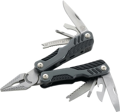 Zange mit Feder · 8 weitere Werkzeuge · rostfreier Stahl · zweifarbige Alu-Kunststoff-Griffe · Nylonetui
