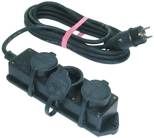 mit 3 Schutzkontaktsteckdosen · Spritzwasserschutzdeckel aus Gummi · 5 m Anschlussleitung H07RN-F 3 x 1,5 mm² · angespritzer Stecker · · zum ständigen Einsatz im Freien