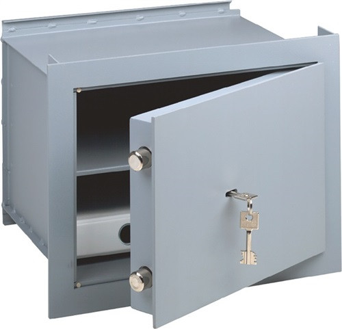 Sicherheitsstufe B nach VDMA Einheitsblatt 24992, Ausgabe 1995 · Einmauerschrank · Tür doppelwandig · bietet Schutz gegen leichte Brände · Feuerschutzmaterial nach DIN 4102-A1 · mit umlaufendem Feuerfalz · Verriegelung durch Riegelbolzen · mit Sicherheits-Doppelbartschloss VdS-geprüft Klasse 1, 9 Zuhaltungen · über 1 Million verschiedene Schließungen · 2 Schlüssel · 1 Fachboden · für DIN A4-Ordner geeignet (liegend) · Montage-Hinweis: Die Maueröffnung muss so groß sein, dass der Tresor allseitig mit 100 mm Beton umgeben ist. · Weitere technische Eigenschaften Elektronisch: nein • Ausführung: Doppelbartschloss