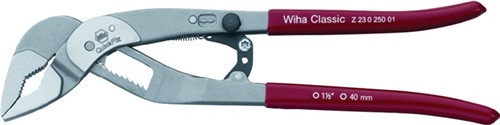 Chrom-Vanadium-Werkzeugstahl · vergütet · schnell und einfach einstellbar durch automatisches, durchgestecktes, fein abgestuftes Gelenk · dadurch optimale Anpassung an den zu greifenden Gegenstand · zusätzliche induktive Härtung der Greifbacken Kopf poliert · Griffe mit Kunststoff-Tauchhülle