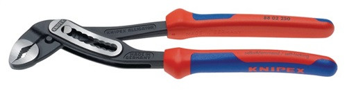 DIN ISO 8976 · durchgestecktes Gelenk · hohe Stabilität durch doppelte Führung · selbstklemmend an Rohren und Muttern · kein Abrutschen am Werkstück · kraftsparendes Arbeiten · Klemmschutz verhindert Quetschverletzungen · Greifflächen mit spezialgehärteten Zähnen · Härte der Zähne ca. 61 HRC · dauerhaft sicheres Greifen durch hohe Verschleißfestigkeit · Chrom-Vanadin-Elektrostahl · geschmiedet · ölgehärtet · mehr Leistung und Komfort im Vergleich zu herkömmlichen Wasserpumpenzangen gleicher Länge: 9-stufige Rastenverstellung für 30 % mehr Greifkapazität Kopf poliert · Zange schwarz atramentiert · Griffe mit ergonomischen 2-Komponenten-Hüllen