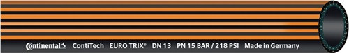 schwarze, porenfreie, glatte EPDM-Innenschicht · Temperaturbereich: -20 °C bis +100 ° C · Druckträger: synthetische Garne · hochflexibel, drallfrei und knickstabiel · EPDM-Außenschicht, ozon- und witterungsbeständig · LABS-, Trennmittel- und fettfrei Kennzeichnung: 6 orangefarbene, axial verlaufende Streifen auf schwarzem Untergrund „Continental ContiTech EURO TRIX® Made in Germany". Einsatzmöglichkeiten: Der EURO-TRIX® Wasserschlauch ist das Markenprodukt für den universellen Einsatz. Er eignet sich für den sicheren Betrieb in mobilen oder stationären Leitungssystemen in der Industrie, im Bauwesen, im Gewerbe, in der Landwirtschaft, im Landschafts- und Gartenbau, in Kommunen, Fuhrparks etc. Dabei zeichnet er sich besonders durch Flexibilität, Robustheit und einfachsten Handling aus. · Weitere technische Eigenschaften Biegeradius: 120mm • Gewicht: 0,58kg/m