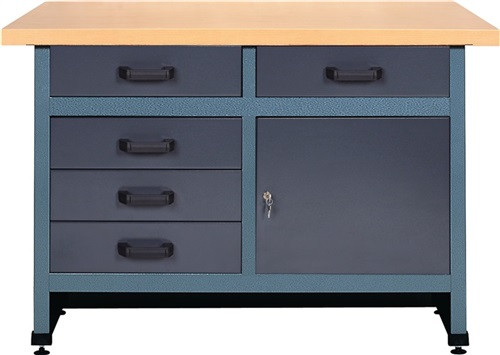 mit Unterschrank · stabile Stahlblechkonstruktion, bis zu 1mm Stärke · kratzfeste Pulverbeschichtung · Rahmen: Hammerschlagsilber · Schubladen/Tür: Anthrazit · höhenverstellbare Füße zum Ausgleich von Bodenunebenheiten · Arbeitsplatte aus 40 mm Buchenechtholzfurnier, schmutzabweisend und abwaschbar lackiert · Schubladen mit Führungsrollen für komfortablen Auszug und dauerhaften Leichtlauf, inkl. Auszugssperre, Traglast 20 kg · Schubladen (H. 12 cm) · 1 Tür mit Sicherheits-Zylinderschloss und Ersatzschlüssel · Lieferung demontiert zum System passender Werkzeugschrank siehe Art.-Nr. 40 00 870 177 · Weitere technische Eigenschaften Tragfähigkeit pro Schublade: 20kg • Anzahl Schubladen: 5