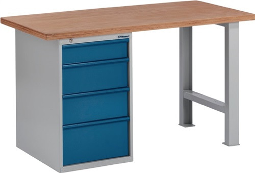 robuste Werkbank für alle Einsatzbereiche · mehrschichtig verleimte Buche-Multiplexplatte 40 mm stark · oberflächenbehandelt · Untergestell aus verschweißtem Vierkantrohr 40 x 40 x 2 mm · innenliegende Schubladen, 4-fach kugelgelagert mit Einfachauszug 90% · Tragfähigkeit pro Schublade 100 kg · Schubladeninnenmaß B 459 x T 459 mm · Gehäuse und Schubladen sind durch ein Zylinderschloss abschließbar · widerstandsfähige Einbrennlackierung · Weitere technische Eigenschaften Tragfähigkeit pro Schublade: 100kg • Schubladeninnenbreite: 459mm • Schubladeninnentiefe: 459mm • Anzahl Schubladen: 4