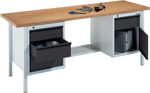 robuste Werkbank für alle Einsatzbereiche · mehrschichtig verleimte Buche-Multiplexplatte 40 mm stark · oberflächenbehandelt · Untergestell aus verschweißtem Vierkantrohr 40 x 40 x 2 mm · innenliegende Schubladen, 4-fach kugelgelagert mit Einfachauszug 90% · Tragfähigkeit pro Schublade 100 kg · Schubladeninnenmaß B 459 x T 459 mm · Gehäuse und Schubladen sind durch ein Zylinderschloss abschließbar · widerstandsfähige Einbrennlackierung · Weitere technische Eigenschaften Tragfähigkeit pro Schublade: 100kg • Schubladeninnenbreite: 459mm • Schubladeninnentiefe: 459mm • Anzahl Türen: 1 • Türhöhe: 350mm • Anzahl Schubladen: 4 • Anzahl Ablageböden: 1