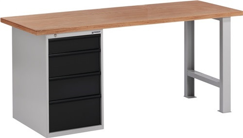 robuste Werkbank für alle Einsatzbereiche · mehrschichtig verleimte Buche-Multiplexplatte 40 mm stark · oberflächenbehandelt · Untergestell aus verschweißtem Vierkantrohr 40 x 40 x 2 mm · innenliegende Schubladen, 4-fach kugelgelagert mit Einfachauszug 90% · Tragfähigkeit pro Schublade 90 kg · Schubladeninnenmaß B 459 x T 459 mm · Gehäuse und Schubladen sind durch ein Zylinderschloss abschließbar · widerstandsfähige Einbrennlackierung · Weitere technische Eigenschaften Tragfähigkeit pro Schublade: 100kg • Schubladeninnenbreite: 459mm • Schubladeninnentiefe: 459mm • Anzahl Schubladen: 4