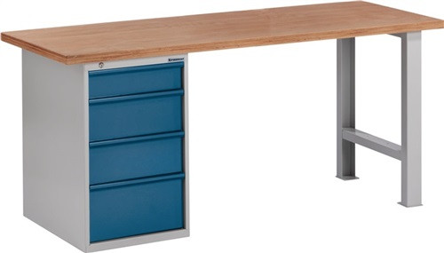 robuste Werkbank für alle Einsatzbereiche · mehrschichtig verleimte Buche-Multiplexplatte 40 mm stark · oberflächenbehandelt · Untergestell aus verschweißtem Vierkantrohr 40 x 40 x 2 mm · innenliegende Schubladen, 4-fach kugelgelagert mit Einfachauszug 90% · Tragfähigkeit pro Schublade 90 kg · Schubladeninnenmaß B 459 x T 459 mm · Gehäuse und Schubladen sind durch ein Zylinderschloss abschließbar · widerstandsfähige Einbrennlackierung · Weitere technische Eigenschaften Tragfähigkeit pro Schublade: 100kg • Schubladeninnenbreite: 459mm • Schubladeninnentiefe: 459mm • Anzahl Schubladen: 4