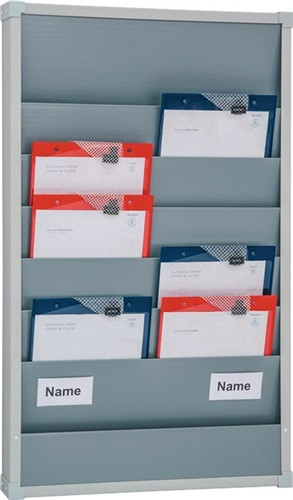 Kunststoff Polypropylen grau · für 6 bis 30 Auftragstaschen oder Belege DIN A4 · mit Ablagefach, Tafeln beliebig aneinander ansetzbar · Einstecktiefe 210 mm · Sichtrand 96 mm · Lieferung inkl. Befestigungsmaterial