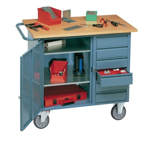stabile Stahlblechausführung · Zentralverschluss mittels Zylinderschloss · Arbeitsplatte aus Holzwerkstoff, Oberfläche Buchedekor, Stärke 19 mm · Fachböden verstellbar · 2 Lenk- und 2 Bockrollen, Lenkrollen mit Feststeller · TPE-Bereifung, Naben mit Rillenkugellager · Korpus/Front taubenblau, RAL 5014 · Aus transporttechnischen Gründen sind Arbeitsplatte und Räder nicht montiert. Leichte Selbstmontage. · Weitere technische Eigenschaften Schubladen-Innenmaße B x T: 280 x 470mm • Ladeflächenbreite: 985mm • Tragfähigkeit pro Schublade: 35kg • Fronten: taubenblau, RAL 5014 • Anzahl Fachböden: 2 • Anzahl Flügeltüren: 1 • Gehäuse: taubenblau, RAL 5014 • Radbreite: 40mm • Arbeitshöhe: 920mm • Rad-Ø: 160mm • Bereifung: TPE • Anzahl Schubladen x Höhe: 6 x 95mm • Ladeflächenlänge: 590mm