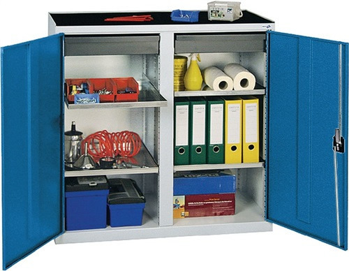 Stahlblechkonstruktion mit widerstandsfähiger Pulverbeschichtung · ausgestattet mit Schubladen und herausziehbaren Fachböden, mit allseitigem Rand, Höhe 30 mm, auf kugelgelagerten Präzisionsauszügen, 80% ausziehbar · Schubladen, H 100 mm und Fachböden im 33-mm-Raster höhenverstellbar · Tragfähigkeit pro Fachboden/Schublade 35 kg · obere Ablage mit Abrollrand · Flügeltür abschließbar mit Zylinderschloss und Drehriegelverschluss mit 3-Punkt-Verriegelung Lieferung erfolgt ohne Inhalt · Weitere technische Eigenschaften Tragfähigkeit pro Schublade: 35kg