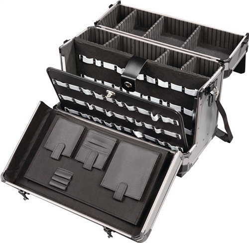 rollbar · Aluminiumrahmen-Werkzeugkoffer · 2-teiliger Deckel (verschiedene Möglichkeiten beim Öffnen des Koffers) · zusätzliche seitliche Verriegelung · mit zwei Werkzeugtafeln (1 x einseitig, 1 x beidseitig bestückbar) · flexible Einteilungen · zusätzliche Halterungen für Stifte und Visitenkarten usw. · zwei Zahlenschlösser · Komfortgriff · abnehmbarer Tragegurt · abnehmbares Fahrgestell · Teleskopfahrgriff