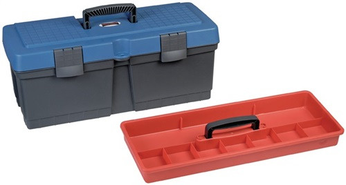 robuster Koffer für Handwerk und Industrie aus bruchsicherem, formstabilem Polypropylen · ausgestattet mit Trageeinsatz für Kleinteile mit versenkbarem Tragegriff · Scharniere mit verzinkten Metallachsen · sicher schließende Klappverschlüsse · mit Öse zur Anbringung eines Vorhängeschlosses