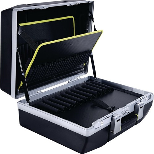 Kofferschalen aus ABS-Kunststoff · Öffnungssystem mit Gasdruckzylindern, leichtes und sicheres Öffnen und Schließen · extrem massiver aus einem Stück gefertigter Alumininiumdruckgussrahmen, im Rahmen verschraubte, hohe und robuste Füße · Zwei im Rahmen versenkte abschließbare Zylinderschlösser · Komfort-Tragegriff · Werkzeugpaneel öffnet sich mit 30° - klare Übersicht und einfacher Zugriff auf die Werkzeuge Ausführung: - 1 Werkzeugpaneel mit 23 Einsteckfächern auf der Vorder- und einem Dokumentenfach auf der Rückseite - 1 Werkzeugpaneel mit 28 Einsteckfächern auf der Vorder- und 17 Einsteckfächern auf der Rückseite - zusätzlich auf der Bodenplatte 11 Einsteckfächer - Bodenschale bestückt mit 2 herausnehmbaren Facheinsätzen (BA-Höhe) - belastbar bis 25 kg (Ausführung mit TSA-Schloss, siehe Art.-Nr. 40 00 795 758) · Weitere technische Eigenschaften Gewicht: 25kg