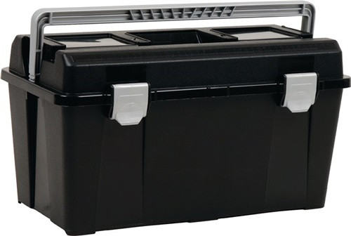 aus robustem PP-Kunststoff mit stabilen Schnappverschlüssen · mit klappbarem Tragebügel · mit innenliegender Kleinteile-Sortimentsbox mit transparentem Deckel · ein mehrfach unterteilter, herausnehmbarer Werkzeugträger
