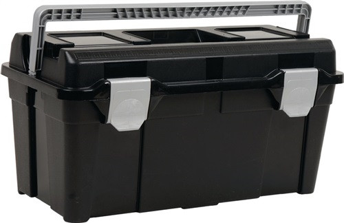 aus robustem PP-Kunststoff mit stabilen Schnappverschlüssen · mit klappbarem Tragebügel · mit innenliegender Kleinteile-Sortimentsbox mit transparentem Deckel · ein mehrfach unterteilter, herausnehmbarer Werkzeugträger