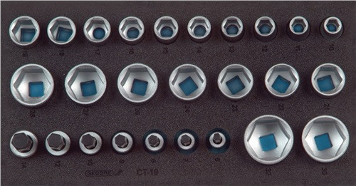 (1/3 Modul) mit Steckschlüssel-Sortiment 12,5 mm (1/2")-Vierkantantrieb · alle Teile aus Chrom-Vanadium-Stahl Inhalt: je 1 6kant -Steckschlüssel-Einsatz 12,5 mm (1/2"), SW 10 - 11 - 12 - 13 - 14 - 15 - 16 - 17 - 18 - 19 - 21 - 22 - 23 - 24 - 26 - 27 - 28 - 30 - 32 mm je 1 Steckschlüssel-Einsatz 12,5 mm (1/2") für Schrauben mit Innensechskant-Profil SW 6 - 7 - 8 - 9 - 10 - 12 - 14 mm
