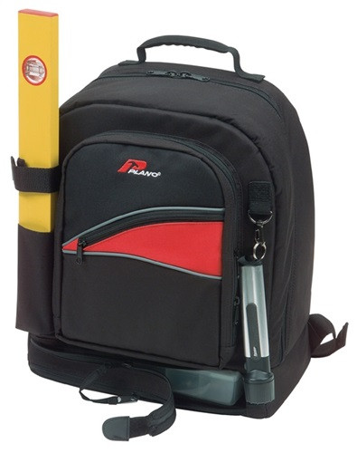 aus verstärktem Spezialstoff · Rückenpolster · mit einstellbaren Schultergurten · doppelter Boden für Kunststoff-Kleinteilebox (im Lieferumfang enthalten) · großes Innenfach mit diversen Einstecktaschen · weitere Außentasche für lange Teile z. B. Wasserwaagen · Material: Polyester