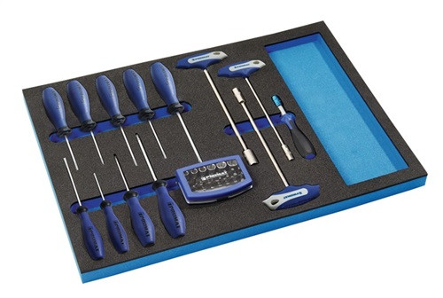 Inhalt: 1 Schraubendreher für Schlitzschrauben Gr. 3,5 x 100mm 1 Schraubendreher für Schrauben mit Kreuzschlitz (PH) PH0 x 60 mm 2 Schraubendreher für Schrauben mit Kreuzschlitz (PZD) Gr. 1 x 80 mm und 2 x 100 mm 5 Schraubendreher für Schrauben mit Innen-TORX®-Profil 1 Bit-/Steckschlüsselset 6-kant, 24-teilig, für Schlitzschrauben, für Schrauben mit Kreuzschlitz (PH + PZD), Schrauben mit Innensechskant-Profil, Schrauben mit Innen-TORX®-Profil 3 Schraubendreher für Außen-Sechskantschrauben Gr. 8 x 200, 10 x 200 und 13 x 230 mm 1 Bithalter mit Handgriff (6,3 mm) 1/4 Zoll Werkzeuge in hochwertiger Einlage aus Schaumstoff