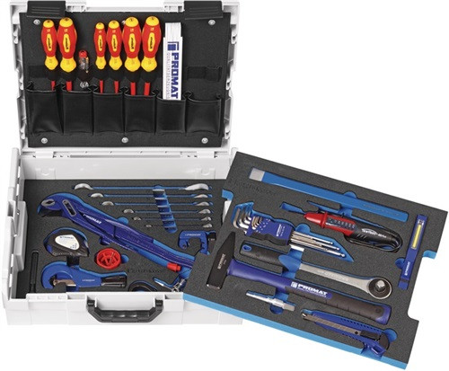 in PROMAT L-BOXX® bestückt mit hochwertigen Werkzeugen für das Sanitär-Handwerk praktische zweifarbige Einlage zur einfachen Werkzeug-Vollzähligkeitskontrolle Bestehend aus: 1 Holzgliedermaßstab Länge 2 m, weiß feuchtigkeitsfest 1 Schraubendrehersatz VDE-isoliert, 6 teilig ( Schlitz 3 - 4 - 5,5 - 6,5 - PH 1 - 2) 1 LED Taschenlampe Länge 160 mm, Lichtleistung 120 Im, 3 x AAA Batterien 1 Taschenrollbandmaß Länge 5 m, Breite 19 mm, gelb, Selbstarretierung 1 Knarrenringmaulschlüssel SW 8 mm, Länge 136 mm 1 Knarrenringmaulschlüssel SW 10 mm, Länge 160 mm 1 Knarrenringmaulschlüssel SW 13 mm, Länge 180 mm 1 Knarrenringmaulschlüssel SW 17 mm, Länge 233 mm 1 Knarrenringmaulschlüssel SW 19 mm, Länge 250 mm 1 Knarrenringmaulschlüssel SW 22 mm, Länge 285 mm 1 Winkelschraubendrehersatz 9 teilig (SW 1,5 - 2 - 2,5 - 3 - 4 - 5 - 6 - 8 - 10 mm) 6-kant mit Kugelköpfe 1 Spannungsprüfer 2-polig, LED-Abzeige 1 Eckrohrzange 38,10 mm (1 1/2″) 1 Schlosserhammer 500 Gramm mit 3-Komponenten-Stiel 1 Stufenschlüssel für Ventilnippel 9,53 mm (3/8″) und 12,7 mm (1/2″) 1 Standhahnmutternschlüssel Länge 235 mm 1 Minirohrabschneider Arbeitsbereich 3 - 30 mm 1 Rohrabschneider Arbeitsbereich 3 - 35 mm 1 Wasserpumpenzange Chrom-Vanadium-Lufthärtestahl DIN ISO 8976 Länge 240 mm 1 Maurermeißel Chrom-Vanadium-Lufthärtestahl, Länge 300 mm, Schaft 23 x 13 mm 1 Cuttermesser Breite 18 mm mit Abbrechklinge, automatische Arretierung 1 Cutterklinge Breite 18 mm Stärke 0,5 mm, eisgehärtet 1 Schaltschrankschlüssel Zink-Druckguss 1 Umsteckknarre 12,5 mm (1/2″) 1 Innen-/Aussenentgrater 3,18 - 34,93 mm (1/8 - 1 3/8″) 1 PROMAT L-BOXX®