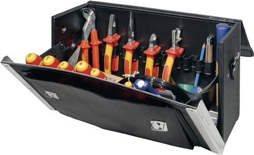 bestückt mit hochwertigen Werkzeugen in Handwerker- und Industriequalität · Bestehend aus: 1 Werkzeugtasche/Schalenkoffer wahlweise, siehe Tabelle, 420 x 160 x 250 mm 1 VDE isolierte Kombizange 180 mm* 1 VDE isolierter Seitenschneider 160 mm* 1 VDE isolierte Storchschnabelzange 200 mm* 1 VDE isolierte Abisolierzange 160 mm, Arbeitsbereich bis max. 5 mm* je 1 VDE isolierter Schraubendreher für Schlitzschrauben (3,0 x 100 mm, 4,0 x 100 mm, 5,5 x 125 mm, 6,5 x 150 mm) je 1 VDE isolierter Schraubendreher für Schrauben mit Kreuzschlitz (PH) Gr. 1 x 80 mm, 2 x 100 mm 1 Elektrikermeißel 200 mm 1 Flachmeißel 250 mm, 23 x 13 mm 1 Schlosserhammer 300 g, mit doppelt geschweiftem Eschenholzstiel 1 Fäustel 1000 g, mit doppelt geschweiftem Eschenholzstiel 1 Holz-Gliedermaßstab 2 m 1 Sägebogen 150 mm, Puk 12 Ersatzsägeblätter 150 mm, für Metall, Kunststoff, usw. 1 Kabelklappmesser 1 teilig mit Holzheft 1 Abisoliermesser mit Hakenklinge, Arbeitsbereich 8 - 28 mm 1 Gipsbecher Durchmesser ca. 125 mm 1 Malerspachtel mit flachovalem, lackiertem Holzheft, Breite: 50 mm 1 Markierstift 17,5 cm 1 Spannungsprüfer DUSPOL ANALOG, Benning 1 Spannungsprüfer 3,0 x 60 mm 1 Durchgangsprüfer DUTEST pro, Benning 1 VDE isolierte Wasserpumpenzange 240 mm, ALIGATOR* Knipex 1 LM-Wasserwaage, 400 mm 1 Einziehband Perlon, Durchmesser 3 mm, 10 m lang je 1 Rolle Isolierband 3,3 m x 19 mm in den Farben gelb, weiß, blau, schwarz, rot, grün *verchromt mit ergonomischen 2-Komponenten-Hüllen