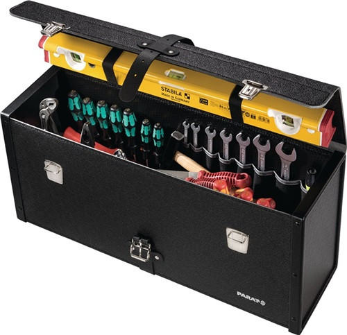 aus Industrieleder/Con-Pearl · schwarz · extra lange Ausführung · Vorderwand mit 13 festen-, Rückwand mit 7 festen Werkzeugschlaufen und 8 genähten Einsteckfächern · Halteschlaufen für Wasserwaage im Deckel · 2 Steckschlösser und 1 Umlaufriemen · mit strapazierfähigen Kunststoffseitenteilen · mit Tragegriff Besondere Produktvorteile: für Anwender die auch lange Teile/Werkzeuge wie z. B. eine 2" Rohrzange, eine 600 mm lange Wasserwaage etc. in einer Tasche transportieren wollen, aber auch Werkzeughalter für Ordnung im Koffer benötigen. Die Kombination aus Industrieleder mit Con-Pearl Innenverstärkung macht die Tasche robust und feuchtigkeitsresistent