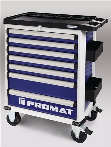 kugelgelagerte, mit Teleskopschienen herausziehbare Schubladen mit 100 % Auszug mit jeweils einer Antirutschmatte · automatischer Schubladeneinzug · Einteilerset für 4 Schubladen beinhaltet · abschliessbar mittels eingebauten Zylinderschloss mit 4 Schlüsseln · hochwertige PVC-Rollen – 2 starre und 2 lenkbare Rollen mit Feststellung · beidseitiges Lochwandsystem (9 x 9 mm) für einfache Installation von Zubehörartikel · Vollauszug der Schubladen · 2 Dosenhalter mit Lochung für Schraubendreher · Kantenschutz an den unteren Ecken robuste Ablagefläche aus Polypropylen mit Ablagefächer für Kleinteile Maß über alles aufgebaut mit Griff und Rädern (B x T x H) 775 x 470 x 1000 mm Maß nur Korpus (B x T x H) 678 x 459 x 817 mm Innenmaß Schubladen (B x T x H) 5 x 568 x 398 x 75 mm, 2 x 568 x 398 x 154 mm Tragkraft pro Schublade 30 kg / statische Gesamtbelastbarkeit 500 kg · Lieferung ohne Werkzeuge/Inhalt