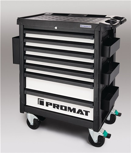 mit 7 auf kugelgelagerten Teleskopschienen herausziehbaren Schubladen mit 100 % Auszug mit jeweils einer Antirutschmatte · automatischer Schubladeneinzug · Schubladensicherheitsystem verhindert selbstständiges Öffnen der Schubladen · mit Zentralverriegelung (nur eine Schublade gleichzeitg geöffnet) · Einteilerset für 4 Schubladen im Lieferumfang enthalten · abschließbar mittels eingebauten Zylinderschloss mit 4 Schlüsseln · beidseitiges Lochwandsystem (9 x 9 mm) für einfache Installation von Zubehörartikel · durchgezogener Kantenschutz · hochwertige PVC Rollen · 4 lenkbare Rollen · 2 davon können starr gestellt werden · inkl. Bremsfunktion an allen 4 Rollen · robuste Ablagefläche aus Polypropylen mit Ablagefächer für Kleinteile und Lochung für Laptophalterung (nicht im Lieferumfang enthalten) Maß über alles aufgebaut mit Griff und Rädern (B x T x H) 790 x 480 x 1035 mm Maß nur Korpus (B x T x H) 678 x 459 x 859 mm Innenmaß Schubladen (B x T x H) 5 x 568 x 398 x 75 mm Innenmaß Schubladen (B x T x H) 2 x 568 x 398 x 154 mm Tragkraft pro Schublade 40 kg / statische Gesamtbelastbarkeit 650 kg · Ausstattung: 3 x Dosenhalter mit Lochung für Schraubendreher 1 x Abfallbehälter 1 x Papierrollenhalter
