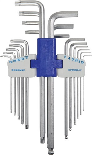 lang · für Schrauben mit Innensechskant-Profil SW1,5-10 langer Schenkel mit Kugelköpfen · der Kugelkopf ermöglicht ein Schrauben bis zu einem Winkel von 25° · für Schrauben mit Innen-TORX®-Profil T10-T50 · S2-Stahl · matt verchromt Besonderer Produktvorteil: alle Winkelschraubendreher für Schrauben von M2-M10 in einem kompakten Satz