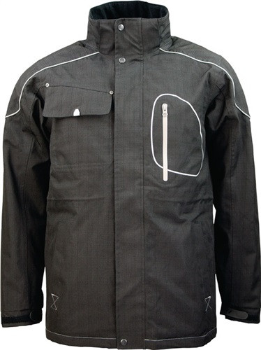 100 % Polyester · Ripstopp mit Reflexbiese · PU atmungsaktiver Beschichtung · Wassersäule 8000 mm, Atmungsaktivität 5000 g/m²/24h · Futter: 100 % Polyester mit Polar Fleece · Reflexbiese im Schulterbereich · 2 seitliche Einschubtaschen · 1 Brusttasche mit Patten · 1 Brusttasche mit wasserdichtem Reißverschluss · Kapuze mit Reißverschluss abtrennbar · Armbündchen mit Klettverschluss verstellbar