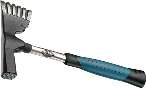 geraute Bahn · Kopf aus legiertem, gehärtetem Spezialstahl geschmiedet, fein geschliffen · gehärteter Schutzring aus Stahl für zusätzliche Sicherheit · Zahnschneide führt zu geringer Vibration beim Aufschlag · Stiel aus Chrom-Molybdän-Rohr · 2-Komponentengriff blau/schwarz